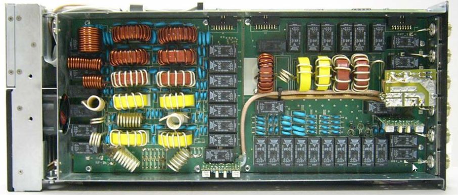 カバーを外した本他の写真から、冷却ファン4 基、右側に入力コネクター2個、左側にアンテ ナ・コネクター4個が見えます。